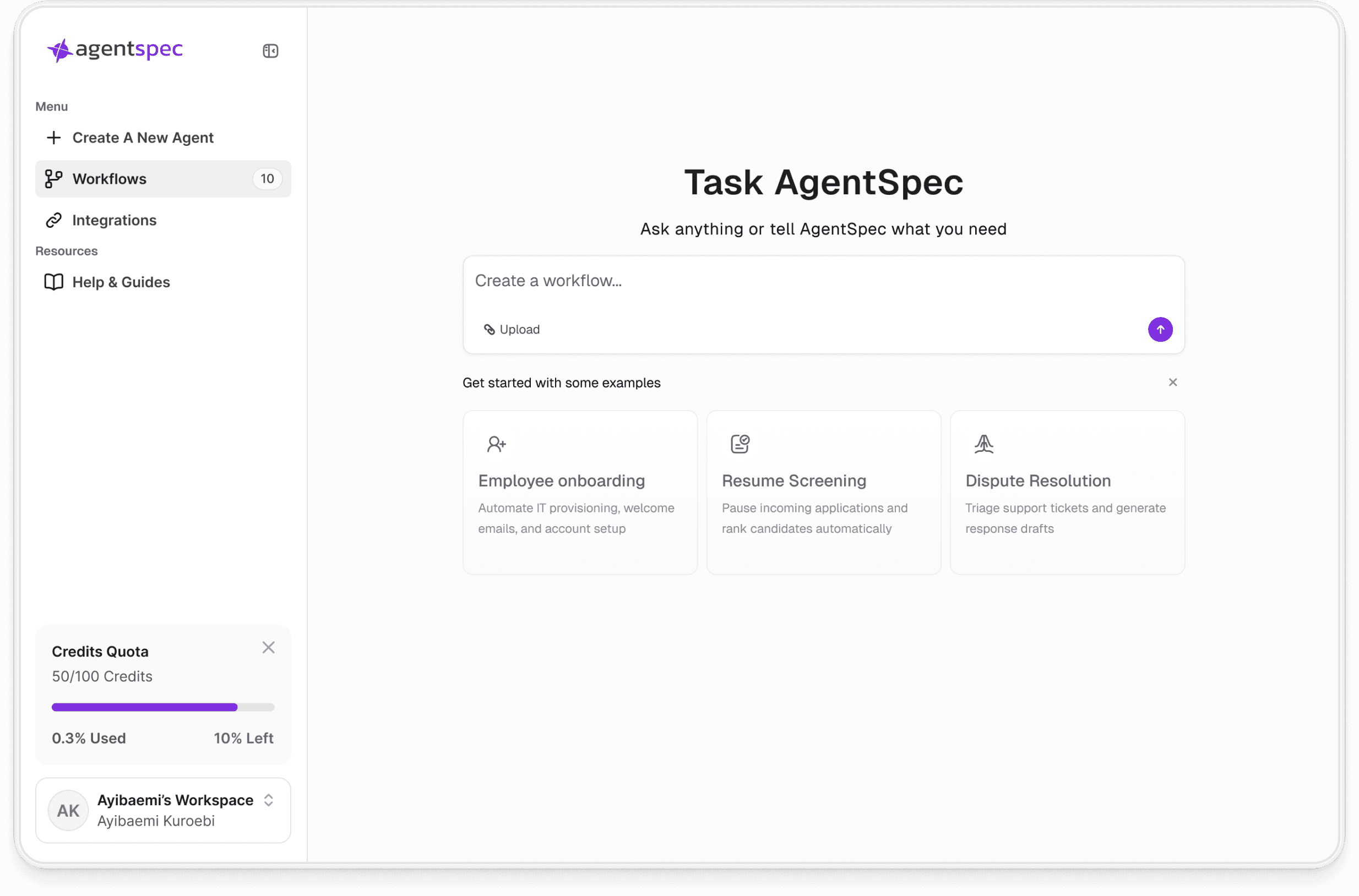 From internal team tasks to high-level business processes, AgentSpec deploys AI agents that execute workflows automatically across your organization.